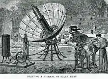 The device consisted of a concave mirror 3.5 meters in diameter centering on a cylindrical steam boiler, which powered a small vertical engine of 2/5 horse power, and then driving a Marioni type printing-press.
