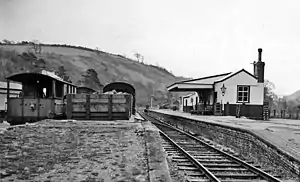 The station was incorporated into the Great Western Railway during the Grouping of 1923, passing on to the Western Region of British Railways on nationalisation in 1948. Passenger services were discontinued in 1951 and freight in 1963. The station was host to a GWR camp coach from 1934 to 1939.[2][3] A camping coach was also positioned here by the Western Region from 1952 to 1956, the coach was joined by another so there were two coaches from 1957 to 1962.[4]
