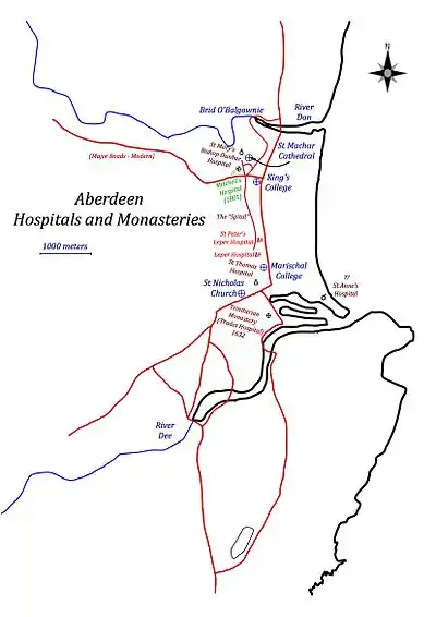 From the early twelfth century, hospitals had been built by church foundations across Europe to meet the needs of the poor and elderly (see Hospitals in medieval Scotland for more details on medieval hospitals).[7] In general the church applied a doctrine of charity[8] in which the elderly, infirm and those suffering from diseases such as leprosy were cared for in hospitals. Few Pre-Reformation hospitals provide what is now called "health care". The general concern in Pre-Reformation times was for "spiritual health"; in Post-Reformation times the concern was for "physical health". Some hospitals did have physic gardens.[9] The growth of incorporated trades organizations and merchant societies[10] offered an alternative of community care for members and their "relicks".[11] Church hospitals founded before 1559/1560 were: Aberdeen Leper House, St Anne c1363 to 1573; St Peters c 1179 to 1427; St Thomas the Martyr 1459 to uncertain; St Mary's Old Aberdeen 1531 to 2013.