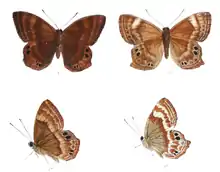 Male. Upperside rich ferruginous-brown. Forewing darker brown externally; with an indistinct small subapical black spot with white pupil; a very large prominent lower black ocellus, with large white pupil, broadly surrounded externally with bright ferruginous-red, which latter colour forms an irregular discal patch extending from the posterior margin and is anteriorly prolonged in front of the subapical spot to near the costa. Hindwing with four anteriorly decreasing moderately small black ocelli with white pupils and darker ferruginous-red outer rings. Cilia dark cinereous. Underside paler ferruginous-brown, more ochraceous brown externally. Both wings with the basal area marked with short dark ferruginous-brown strigae, and with a distinct darker brown transverse discal line, which is widely ochreous bordered externally at its costal end on the forewing, and narrowly with cinereous posteriorly on both wings. Forewing with a minute subapical and a small lower median ocellus, and sometimes a white dot is also present between the upper and middle median veins. Hindwing with six very small ocelli, the four upper and the lowest being minute.