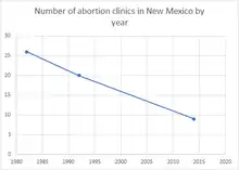 Between 1982 and 1992, the number of abortion clinics in the state decreased by six, going from 26 in 1982 to twenty in 1992.[20] In 2014, there were eleven facilities which provided abortions of which nine were abortion clinics.[21][19] In 2014, 91% of the counties in the state did not have an abortion clinic. That year, 48% of women in the state aged 15–44 lived in a county without an abortion clinic.[22] In March 2016, there were six Planned Parenthood clinics in the state.[23] In 2017, Planned Parenthood closed three clinics in the state. This was done around their plans to try to consolidate reproductive services they offered in the New Mexico.[24] Later that year, there were three total Planned Parenthood clinics in the state. At the time, the population was 456,213 for women aged 15–49 of which two offered abortion services.[24]