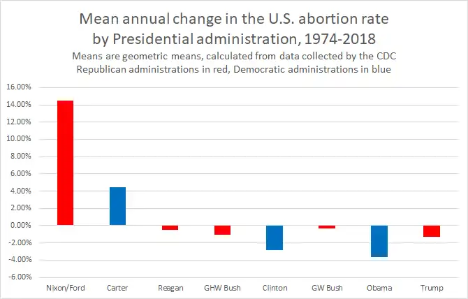 The means in the graph above are geometric means. For example, the mean annual increase during the Carter administration was 4.46%, because the abortion rate rose 19% in the Carter administration, and 104.46%*104.46%*104.46%*104.46%=119%.
