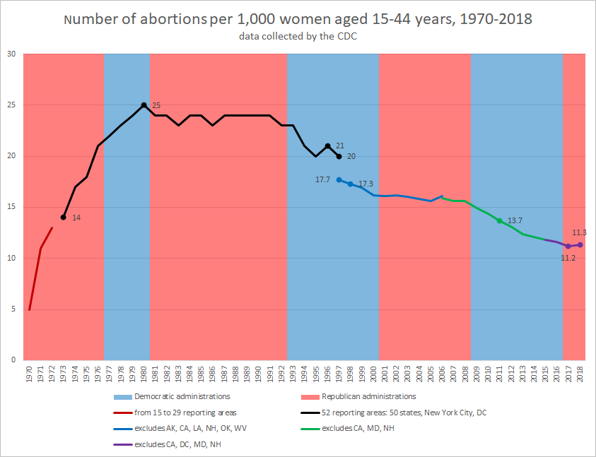 From 1973 to 1983, the abortion ratio, defined by the Guttmacher Institute as the number of abortions per 100 pregnancies ending in an abortion or a live birth, rose about 60%, peaking at 30.4 in 1983. From 1984 through 2016, the abortion ratio fell about 40%, falling more rapidly in Democratic administrations than in Republican ones. It hit a low of 18.3 in 2016 and rose slightly to 18.4 in 2017. The abortion ratio was slightly lower in 2016 and 2017 than in 1973 because a 40% decrease more than offsets a 60% increase. The CDC defines the abortion ratio differently but reports similar trends. According to the CDC, the abortion ratio peaked in 1984, fell to its lowest point in 2017, and increased slightly in 2018.