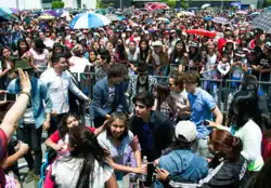 He rose to popularity with the release of AM's first single, "Señorita".[1][9][10] The song, written by Herbie Crichlow and Thomas Troelsen, was listed for 40 weeks on the Spain's Top 50 singles chart, peaked on number three, and was certified Gold in Spain.[52] The music video for "Señorita" was the most trending music video of 2013 on YouTube Spain.[11][12] By April 2013, Mateo was ranked at number 3 on the Billboard's Next Big Sound chart.[53] In July, he performed "Señorita" at the 2013 Premios Juventud Awards in Miami, where he was nominated as "Best New Artist".[28][27][29]