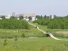 The Abtswoudse Bos is situated in a polder[1] and has trees, bushes, footpaths, cycling roads, ditches, lakes, and small ponds.[2] The area's waters contain many aquatic plants, like reeds, underwater plants, and floating plants. The polder used to consist of meadows.