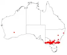 It is found in south western New South Wales where it is considered rare and Victoria where it is more common. It is often a part of Eucalypt forest communities and grows in sandy loamy clay soils over sedimentary substrate.[2]