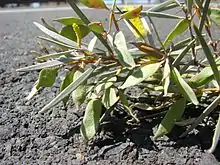 In contrast to the eucalypt woodlands that dominate much of Australia, mulga woodlands are not well adapted to regular fire and species in mulga communities vary in their ability to survive fires.[8][9] Many species, including mulga, have a very limited ability to resprout after fire, and rely instead on mechanisms of seed production for species survival. Many plants produce hard, woody fruits or seeds, which can not only survive intense heat, but also may require the stimulus of fire to scarify and promote germination. Long-lived seed stores in soil is also common in these woodlands.[9][10][11]