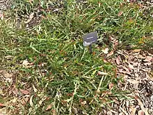 The shrub is a prostrate to semi-prostrate often domed in shape. It typically grows to a height of 0.3 to 0.8 metres (1.0 to 2.6 ft) and a width of 2 m (6.6 ft).[1] The slightly to prominently flexuose and glabrous branchlets have persistent stipules. The evergreen phyllodes are continuous with branchlets and form opposite wings with each one extending to the next below. Each phyllode is 1 to 3.5 centimetres (0.39 to 1.38 in) in length and has a width of 4 to 10 millimetres (0.157 to 0.394 in).[2] It produces yellow spherical inflorescences between August and December.[1] The rudimentary inflorescences contain 16 to 23 light golden flowers. The black seed pods that form after flowering are strongly curved to twice-coiled with a length of around 2 cm (0.79 in) and 2 to 3 mm (0.079 to 0.118 in) wide containing oblong seeds.[2]