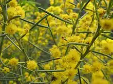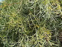 The rounded shrub typically grows to a height of 2 to 4 metres (7 to 13 ft)[3] with some individuals reaching as high as 10 m (33 ft)[1] the width of the plant is usually 2 to 4 m (6 ft 7 in to 13 ft 1 in).[4] The narrowly linear, green to grey-green, terete phyllodes have a length of 2 to 10.5 cm (0.79 to 4.13 in) and a width of 1 to 1.5 mm (0.039 to 0.059 in). The phyllodes have a curved point, are glabrous and sometimes scurfy with four non-prominent nerves.[3] It blooms between October and November producing yellow flowers.[2] The inflorescences are found on two to eight headed racemes. The spherical to obloid shaped flower-heads contain 28 to 46 golden pale yellow to golden flowers. The woody, wrinkled seed pods form after flowering have a moniliform shape, resembling a string of beads, with a length of up to 15 cm (5.9 in) and a width of 3 to 6 mm (0.12 to 0.24 in). The dull dark brown to black oblong-elliptic shaped seeds have a length of 6 to 9 mm (0.24 to 0.35 in).[3]