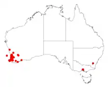 It is native to an area in the eastern suburbs of Perth in the Darling Range and the Peel and the South West regions of Western Australia where it grows in gravelly lateritic or granitic based soils.[1] The species is distributed between Helena Valley in the north and down to around Bridgetown in the south and is often situated near watercourses or among granite rocks as a part of Eucalyptus forest communities.[2]