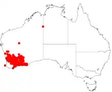 It is native to a large area in the Wheatbelt, Goldfields-Esperance and Great Southern regions of Western Australia,[1] and is found as far north as Eneabba an south as Bremer Bay and east as Kalgoorlie.[3] It is typically found growing as a thicket amongst granite outcrops.[6]