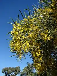 The small yellow globular clusters are found at the stalk of the stem. Each globular cluster contains numerous flowering plants which can range between 35 and 50 flowers per cluster.[1] Each plant contains five petals and sepals and many stamens which gives each cluster of flowers a soft look when fully bloomed.[1] The growth of each globular cluster are weather dependent. Optimal flowering conditions favor temperatures in February through March. If there is growth, it will be indicated by areas of redness. If globular clusters do not appear, the phyllodes that are already produced will continue to grow in an alternating pattern. The fruits of the zig-zag wattle are the black pods that have lima-bean-like structure that are found on the plant. The pods are small, curved and have a smooth exterior casing. The pods appear green initially but begins to turn brown-black as temperatures increase through the spring, eventually reaching full maturation.[1] At full maturation, the pods can reach in length up to 12 cm long. Inside these pods are hard brown seeds in a shape of bean. In an experiment conducted to test the effect of seed germination vs. temperature on Acacia seeds, the results showed that seeds that were treated with hot water had higher germination compared to seeds that were treated with cooler water.[5]