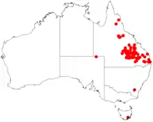 Native to Australia, Acacia macradenia ranges across Central Queensland, Australia and is cultivated in areas around Chinchilla and Pentland.[3] However, due to its invasive growth habits, it has been spotted in parks outside its originated area such as Ipswich.