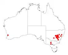 A. mollifolia is endemism to the central tablelands and central western slopes[2] of New South Wales with the bulk of the population found to the west of Peakhill, Boorowa and Bathurst areas to around Rankins Springs where it is often situated on sandstone ridges and on alluvial plains a part of dry sclerophyll forest or woodland communities[1] dominated by species of Eucalyptus and Callitris.[2]
