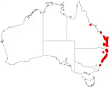 It is endemic to south eastern Queensland and north eastern New South Wales where the bulk of the population is found between Bundaberg in the north down to around Sydney in the south where it grows in sandy soils over sandstone as a part of open Eucalyptus woodland communities.[2] In the Sydney area it is found mostly to the north of Botany Bay and is now extinct in areas further south. A small remnant population is also known on a headland of undisturbed coastal heath near Ulladulla.[3]