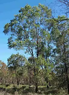 It is endemic along the east coast of central Queensland where it is found from around Eidsvold in the south to around Clermont in the north with another disjunct population neat Mount Garnett furthern north where it is a part of Eucalyptus woodland communities.[1] It is often situated in hilly areas or undulating plains in the eastern part of the brigalow belt where it grows in skeletal sandy to clay soils with poor fertility where it is a part of open forest.[3]