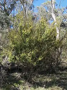 The glabrous shrub typically grows to a height of 2 to 3 metres (6.6 to 9.8 ft) and can sometimes have a procumbent habit.[1] It has smooth to tessellated grey coloured bark and glabrous, terete and resinous branchlets. The rigid, green phyllodes have a very narrowly elliptic to linear-lanceolate shape and are straight to slightly curved. The phyllodes are 1 to 3.5 cm (0.39 to 1.38 in) in length and have a width of 2 to 4 mm (0.079 to 0.157 in) with a prominent midvein and a pungent-pointed apex. The shrub blooms between August and November and produces simple inflorescences that occur singly or in pairs in the axils. The spherical flower-heads have a diameter of 4.5 to 7 mm (0.18 to 0.28 in) and contain 30 to 45 bright yellow or pale yellow to white coloured flowers. After flowering straight and flat, papery seed pods form that are 1.5 to 5 cm (0.59 to 1.97 in) in length and 4 to 7.5 mm (0.16 to 0.30 in). The smooth and glabrous pods have a few fine lateral veins near the margins.[2]
