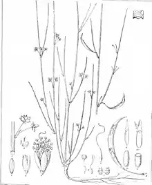 The shrub can have a prostrate, straggling or erect and slender habit and has a rush like appearance. It typically grows to a height of 0.05 to 0.5 metres (0.16 to 1.64 ft) but can grow as high as 1.5 m (5 ft).[1] The branches are slender and wiry as well as finely striated with yellow ribs. The phyllodes have a continuous, thin, horizontally flattened, narrowly triangular scale-like appearance and are only 1.5 to 3 millimetres (0.06 to 0.12 in) in length. Often there are bipinnate leaves found at the base of the stems.[2] It blooms between March and June or October and November producing yellow flowers.[1] The simple inflorescences contain between one and four flowers but usually have two, the petals are finely flabellate-striate. Following flowering reddish brown and glabrous seed pods form . The pods are shallowly curved with a length of 2 to 6 centimetres (0.8 to 2.4 in) and 4 to 5 mm (0.16 to 0.20 in) wide with winged margins that are 1 to 2 mm (0.04 to 0.08 in). The seeds within are oblong-conical with a length of 5 mm (0.20 in) and arranged longitudinally.[2] conical.