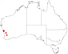 It is native to an area in the Mid West regions of Western Australia where it is commonly situated along the edges of seasonal lakes growing in sandy to sandy-clay soils.[2] It has a limited range near Eneabba especially around Lake Eneabba and is usually a part of low woodland or low open forest communities.[1]