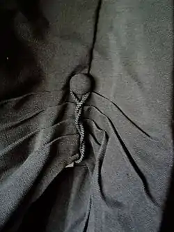 They wear a short black gown gathered at the yoke with pointed sleeves, the point of the sleeve not reaching below the knee, similar to the Oxford scholars gown but with shorter sleeves.