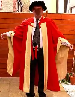 - Professional doctorates: as the PhD but lined with ruby shot silk and without the blue silk binding.