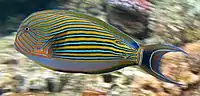 Among the species of the genera Acanthurus and Zebrasoma there are small anatomical differences: the first are disc-shaped and have a crescent-shaped tail, while the Zebrasoma species have ovaloid profile and a protruding muzzle.