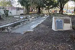 ![]() Acequia Madre de Valero (Main Irrigation Ditch of Valero Mission). One in a network of ditches begun by the Spanish and their Indian charges at the founding of San Antonio in 1718. Hand-dug and made of dressed limestone, the acequia diverted water from San Antonio River through fields belonging to San Antonio de Valero Mission. Irrigation was the key to the growth of mission and town. The ditch paralleled present Broadway by Brackenridge Park and Alamo Street, then fed back into the river southwest of this section. It became part of modern waterworks after 1877. This section was restored, 1968. #78 | |