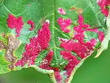 These galls begin as pale greenish patches which develop into a rich red-purple colour as the season progresses, peaking in concentration in the summer. These patches are composed of minuscule papillae containing a red fluid.