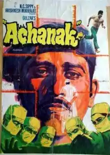 Achanak (Hindi: अचानक, translation: Suddenly) is a 1973 Indian Hindi film, directed by Gulzar, written by Khwaja Ahmad Abbas, and starring Vinod Khanna. Gulzar received a Filmfare nomination as Best Director for this film. Even though Gulzar is an accomplished lyricist, this film did not have any songs in it.[1] K.A. Abbas earned a Filmfare nomination for best story.[2] It is inspired by the real-life sensational 1958 murder case KM Nanavati v State of Maharashtra.[3]