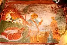 The Achi monastery is a single-nave hall church, built of hewn stone. Constructed at the end of the 13th century or in the early 14th, it was later reroofed, renovated and surrounded by a defensive wall. The whole interior is frescoed. Some murals, stylistically dated to the late 13th century and betraying affinities with the Palaeologan art, are iconographic rarities, such as those depicting the life of Saint George. One of the accompanying inscriptions, in Greek, mentions Onesimos, a Trapezuntine, probably a painter. A Georgian inscription in the asomtavruli script, mounted on the eastern façade, reads: "Saint George, intercede for the lords Saghir, Rati, and Ushanian, and intercede for Nikoloz of Achi and the stonemasons Mikel and Mkhetsidze."[1][2]