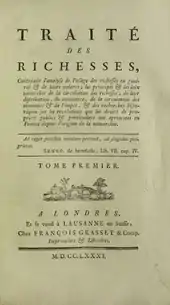 In 1781, at the age of 33, Isnard anonymously published his Traité des richesses, in two volumes with the London publisher François Grasset. Later in 1801 he published his Considérations théoriques sur les caisses d'amortissement de dette publique, under his own name in Paris. The former is directed against the theory of the produit net and of the single tax of Quesnay; Isnard does not mention Adam Smith, although generally concurring with the latter's views on the origin of wealth, the effects of protection, and of the accumulation of gold and silver, etc.[7]