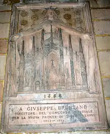 His statuette, Il barcaiuolo, was exhibited in 1883, and the next year in Turin. He also completed the bronze statuary group Due giugno; Apoteosi (1886); Leda (1887, Mostra di Venice); a stucco Mater dolorosa (1888, Bologna); a bronze figurine of Il panattiere; and Maria, a marble bas-relief.[2] At the Galleria d'Arte Moderna of Milan, a half dozen of his works are displayed: a bronze bas-relief of Pindar in the Theater of Athens (1891); a stucco bas-relief of Bathers (1891); a marble Portrait of the poet Gian Pietro Lucini (1897); a marble bust of Maniscalco (1900); a bronze Virago (1907); and a bronze Bustino di Ragazzo (1910).[3]