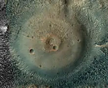 Cone-shaped features with higher albedo than surrounding rocks litter the surface of Acidalia Planitia. The most similar terrestrial feature to these formations are mud volcanoes.[8] On Mars, mud volcanoes have an average diameter of ~1 km and a relief of 10 to 180 meters. Their higher albedo is a result of more crystalline iron oxides than the rest of Acidalia Planitia.[8] Mud volcanoes erupt sediments from deep beneath the surface and change the rising rocks very minimally. These rocks are used to analyze organic matter as mud volcanoes also create subterranean conduits for ancient ground water that may have hosted microbiota.[8]