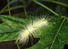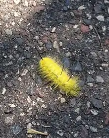 The young caterpillar is densely covered with yellow setae. The older caterpillar's setae are either pale yellow or white. All instars have thin, black setae on the first and third abdominal segments. On the eighth abdominal segment, there is one tuft of black setae. The caterpillar will reach a length 50 mm (2.0 in).[3] While there are numerous reports of the larval hairs of this species sometimes causing skin irritation in humans, there is no evidence that they possess any form of venom.[4]