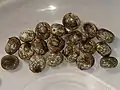 Pupae are approximately 3–4 cm long, and rounded. Female pupae reach 7-10 grams, while male pupae reach 4-7 grams. Pupae are wrapped in a cocoon constructed as a thin single layer of yellow silk. The cocoon is easily permeable by the elements, and has a vent opening at the head end. Pupal development can be slowed at temperatures of about 15 °C - but this is not true diapause; The pupae will continue to develop at a decreased rate. If kept at 20 °C the moths emerge in around four weeks. Some pupae have black colouration, while others are brown. In those that have black colouration, it is not possible to see the wing patterns developing prior to emergence.