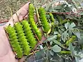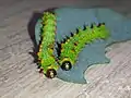 Larvae have five instars (molts/stages). The first instar is orange/brown, with a black band around the middle segments. The width of the dark band is variable. The larva has a dark brown head capsule. The larva changes to green at the start of the second instar, developing red/orange tubercles toward the end of the second instar. By the fourth instar, the tubercles become black and spiny. Later instars also develop white dot patterning. The larva can reach a maximum length of approximately 9-10 centimetres, and mass of 15 grams.
