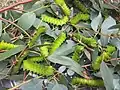 Food plants used in captivity include Eucalyptus gunnii, Liquidambar (sweetgum), Rhus (sumac), Prunus lusitanica (Portugal laurel), Arbutus unedo (strawberry tree) and Betula (birch). Crataegus (hawthorn), various types of rose, salix and Quercus ilex (holm oak) can be used, but with poor results.