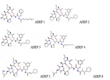 Acyldepsipeptide or cyclic acyldepsipeptide (ADEP) is a class of potential antibiotics first isolated from bacteria and act by deregulating the ClpP protease. Natural ADEPs were originally found as products of aerobic fermentation in Streptomyces hawaiiensis, A54556A and B,[1] and in the culture broth of Streptomyces species, enopeptin A and B.[2] ADEPs are of great interest in drug development due to their antibiotic properties and thus are being modified in attempt to achieve greater antimicrobial activity.[3][4]