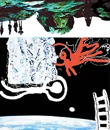 Mee's materials include acrylic paint, watercolour, gouache, pencil, Indian ink on wood, card and various paper types.