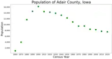 Adair County is a county in the U.S. state of Iowa. As of the 2020 census, the population was 7,496.[1] Its county seat is Greenfield.[2]