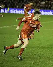 On 17 September 2015, Lallana scored the opening goal in the new Europa League season opening group stage away match against Bordeaux at the Stade Chaban-Delmas, a match Liverpool went on to draw 1–1.[51] On 1 October, Lallana scored in a second match in a row against Sion in the Europa League but the match ended in a 1–1 draw.[52] On 23 January 2016, he came on as a second-half substitute and scored an injury-time winner in Liverpool's 5–4 away win at Norwich City.[53] On 28 February 2016, Lallana came on as a second-half substitute and missed in the penalty shoot-out against Manchester City, resulting in Liverpool's defeat in the 2016 League Cup Final.[54] On 3 March 2016, he scored and assisted in Liverpool's 3–0 home win against Manchester City.[55] On 23 April, he scored Liverpool's second goal against Newcastle United, which took the Reds to a 2–0 half-time lead, but the match ended with a 2–2 draw.[56] On 5 May, he scored the third goal in Liverpool's second-leg win over Spanish team Villarreal in the Europa League semi-finals, with the Reds advancing to the final with a 3–1 aggregate win.[57]
