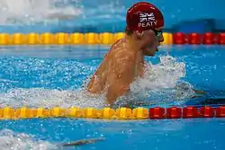Peaty only competed in the 100 metre breaststroke in the individual events as 50 metre breaststroke was not an Olympic swimming event at the 2016 Summer Olympics in Rio de Janeiro.[33] In the heats, Peaty broke his own world record with a time of 57.55 seconds.[34] He then won his semi-final and went on to win the final, breaking the new world record that he himself had set in the heats, and winning Team GB's first gold medal of the 2016 Olympics[35] on 7 August 2016, winning with a time of 57.13 seconds.[36][37] He won a further silver medal in the 4 × 100 metre medley relay with Walker-Hebborn, Guy and Scott.[38]