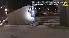 Body cam footage of Toledo's shooting, released on April 15, 2021, showed that Toledo was unarmed at the moment he was shot.[47][48][49] The video shows officer Stillman chasing Toledo into the alleyway and yelling at him to stop.[47][50] Toledo slows down and stops as Stillman catches up to him.[47][50] In footage taken from another angle, Toledo appears to throw a pistol behind a fence just before turning to face the officer (body cam footage shows a pistol being recovered behind the fence two minutes after the shooting).[47][48] Stillman yells "Show me your fucking hands" and "drop it" while flashing a strobe flashlight at him.[47] Toledo turns around with his empty hands in the air, and Stillman then shoots Toledo as he does so.[47][48]