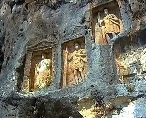 On the rocks facing the gorge, there are carved figures in nine niches. These are the figures of eleven males, four females and two children and one ibex. (The name Adamkayalar means Men-rocks) On pediment, there are also the figures of Roman eagles (Aquila).[1] No document exists about the origin of the figures, but they are probably from the second century AD.[2]