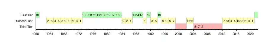 - Second Tier (1.Lig):[lower-alpha 4] 1963–1973, 1984–1987, 1990–91, 1992–1994, 1995–1999, 2002–2004, 2012–2021