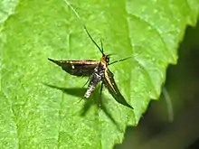 The wingspan of Adela australis can reach about 15 millimetres (0.59 in). These moths have the upper wings crossed by a white belt and a metallic patterns coloration ranging from golden to violet. Males have brown hair on their heads, with very long antennae, 2–3 times as long as the forewing.