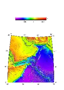 Extension of the Gulf of Aden rift system began in the late Eocene - early Oligocene (~35 Ma ago), caused by the northeast escape of the Arabian plate from the African plate at a rate of ~2 cm/yr, and the development of the Afar plume.[1] Extension eventually gave way to seafloor spreading, first initiated near the Owen transform fault ~18 Ma ago.[1] Seafloor spreading then propagated as far west as the Shukra-El Shiek fault at a rate of ~14 cm/yr ~6 Ma ago rifting propagated west of the Shukra-El Shiek fault until terminating at the Afar plume.[2] The Afar plume is believed to have contributed to the initiation of the Aden ridge, due to the flow of hot mantle material being channeled along the thin lithosphere beneath the Gulf of Aden.[3] Currently, the Aden Ridge is undergoing extension at a rate of ~15 mm/yr.[4]
