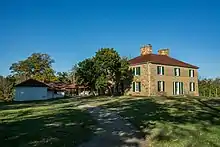 The stone mansion has historically accurate interiors, including furnishings. The grounds cover 300 acres (1.2 km2) of the original 2,000-acre (8.1 km2) estate. There is a garden area featuring kitchen herbs and heirloom vegetables, with some varieties available for purchase. A former overseer's house has also been restored and demonstrates life for German immigrants to the area.