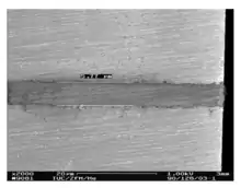 SU-8 is a 3 component UV-sensitive negative photoresist based on epoxy resin,[11] gamma butyrolactone and triaryl sulfonium salt. The SU-8 polymerizes at approximately 100 °C and is temperature-stable up to 150 °C. This polymer adhesive is CMOS and bio-compatible and has excellent electrical, mechanical and fluidic properties. It also has a high cross-linking density, high chemical resistance and high thermal stability. The viscosity depends on the mixture with the solvent for different layer thicknesses (1.5 to 500 µm). Using multilayer coating a layer thickness up to 1 mm is reachable. The lithographic structuring is based on a photoinitiator triaylium-sulfonium that releases lewis acid during UV radiation. This acid works as catalyst for the polymerization. The connection of the molecules is activated over different annealing steps, so called post exposure bake (peb).[5] Using SU-8 can achieve a high bonding yield. In addition, the substrate flatness, clean room conditions and the wettability of the surface are important factors to achieve good bond results.[12]