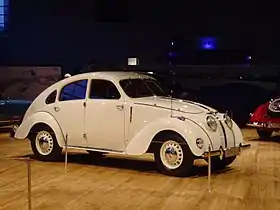 Welded to the frame was a four-door fast back steel body for which the drag coefficient quoted was a remarkable 0.36. The standard body came with four doors, all hinged on the B-pillar, and a huge steel sun roof panel which extended almost to the full width of the roof, and from just behind the front windscreen to half way over the rear doors. In 1939 the size of the removable roof panel was reduced in order to make it more manageable.[3] At the front two headlights were placed close together either side of the grill, but these proved inadequate, and in 1938 a second pair of “wide beam” lights was set into the wings, although from 1938 the regulations permitted only one of these.